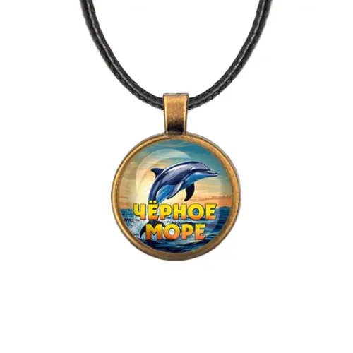 Кулон из бижутерного сплава со шнурком, с изображением Черного моря под выпуклой стеклянной линзой.