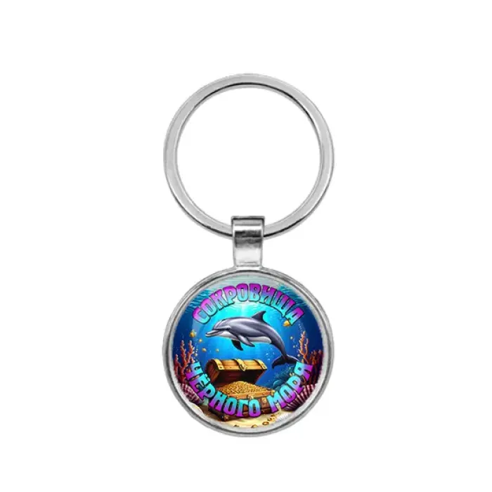Брелок круглой формы из бижутерного сплава с покрытием под серебро и стеклянной линзой. Относится к коллекции «Сокровища Чёрного моря».