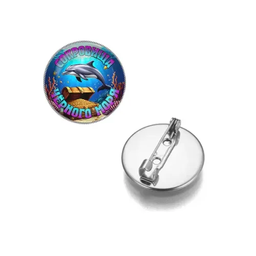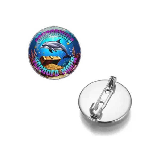 Круглый значок из коллекции «Сокровища Чёрного моря» из бижутерного сплава с серебряным покрытием и стеклянной линзой.