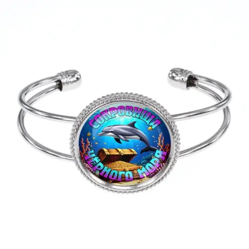 Металлический браслет из коллекции «Сокровища Чёрного моря» с центральным элементом под стеклянной линзой.
