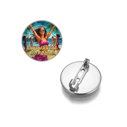 Круглый значок «Отдыхаем хорошо» из бижутерного сплава с серебристым покрытием и защитным стеклом.