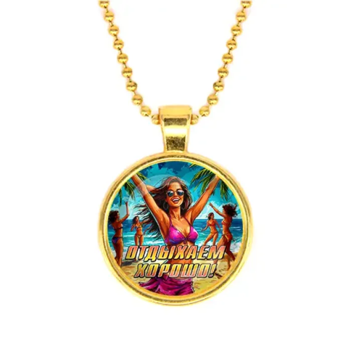 Кулон из бижутерного сплава с покрытием под золото и стеклянной линзой, модель «Отдыхаем хорошо».