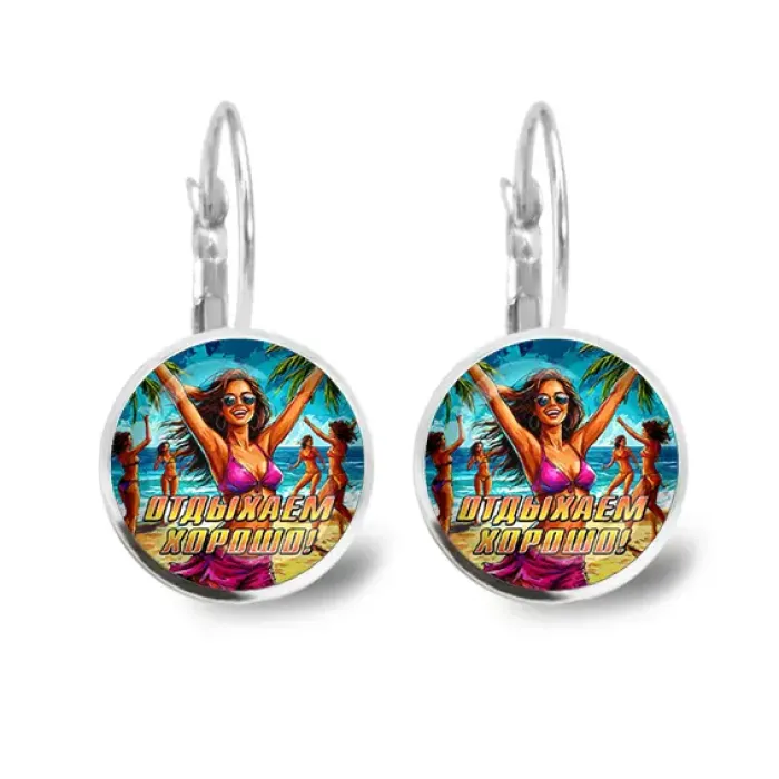 Серьги для носки, выполненные из бижутерного сплава с покрытием под серебро и стекла. Дизайн включает изображения под выпуклыми стеклянными линзами диаметром 18 мм и замок типа левербэк.