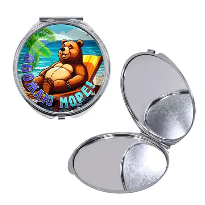 Круглое складное зеркало с полноцветным принтом «Обожаю море» на металлической основе.