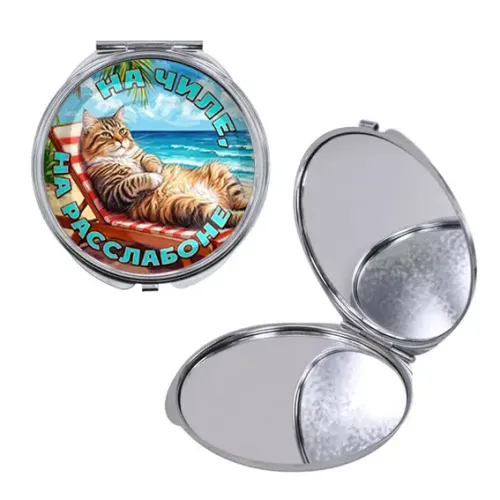 Складное зеркало круглой формы из металла и стекла с полноцветной печатью.