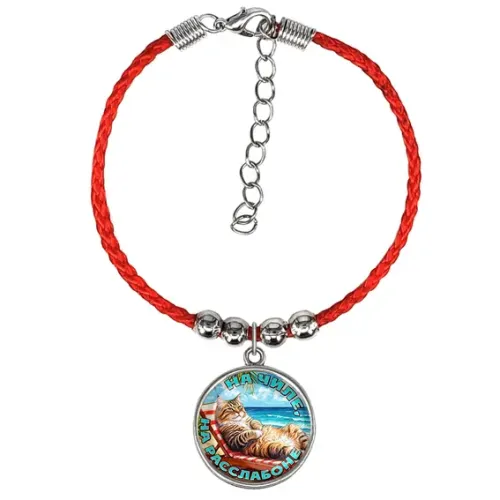 Браслет из красного шнура с металлической основой и изображением под выпуклым стеклом.