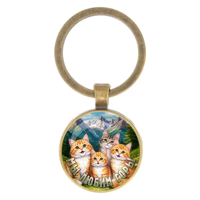 Круглый брелок для ключей из бижутерного сплава с бронзовым покрытием и стеклянной линзой. Дизайн с надписью «Мы любим горы».