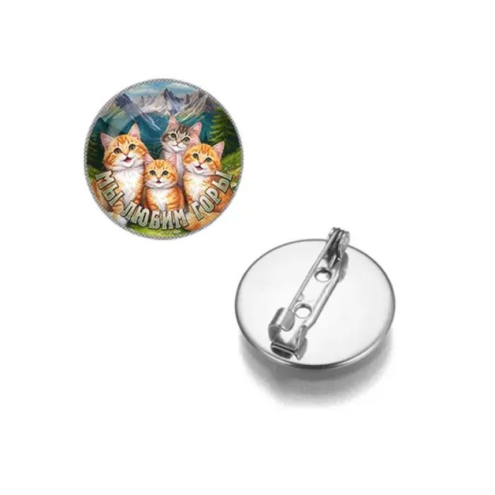 Круглый значок из бижутерного сплава с надписью «Мы любим горы».