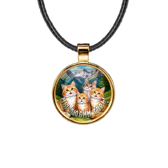 Кулон «Мы любим горы» — сувенирный аксессуар из бижутерного сплава с золотым покрытием и стеклянной линзой.