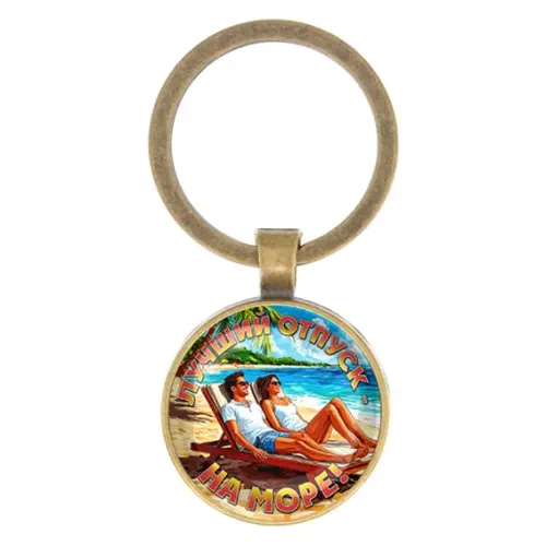 Брелок круглой формы в бронзовом цвете с изображением на тему отпуска. Изготовлен из бижутерного сплава и стекла.