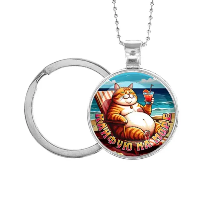 Кулон-брелок из бижутерного сплава с серебристым покрытием и стеклянной линзой, с изображением "Кайфую на море".