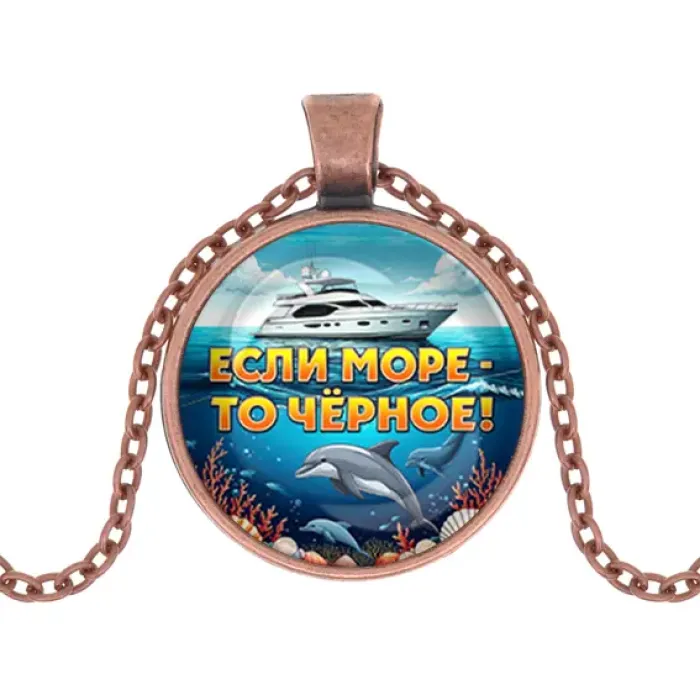 Кулон из бижутерного сплава с покрытием под медь и стеклянной линзой. Дизайн с надписью «Если море, то Чёрное».