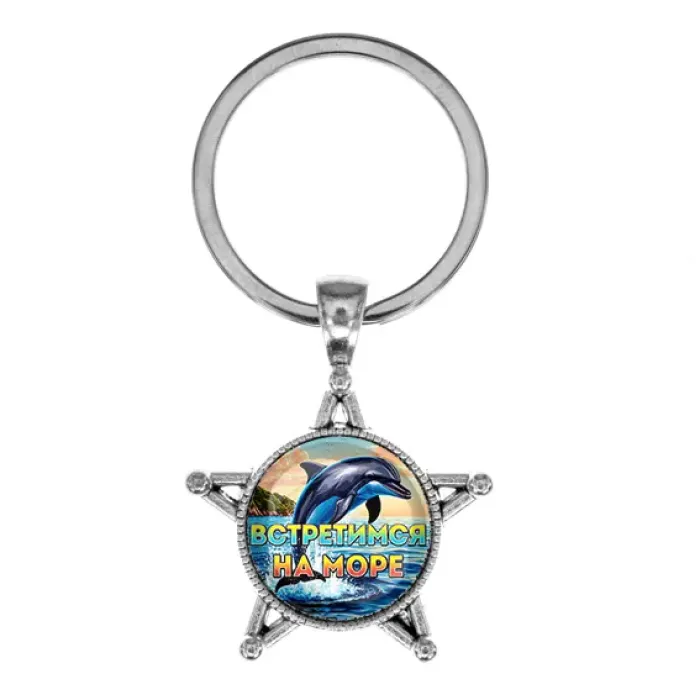 Брелок в форме звезды из бижутерного сплава под серебро со стеклянной линзой.