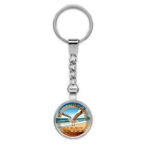Круглый брелок с изображением Балтийского моря. Изготовлен из бижутерного сплава со стеклянной линзой.