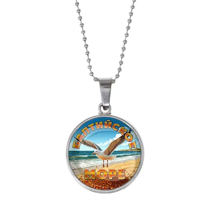 Кулон с цепочкой из бижутерного сплава с серебристым покрытием и стеклянной линзой, тематика — Балтийское море.