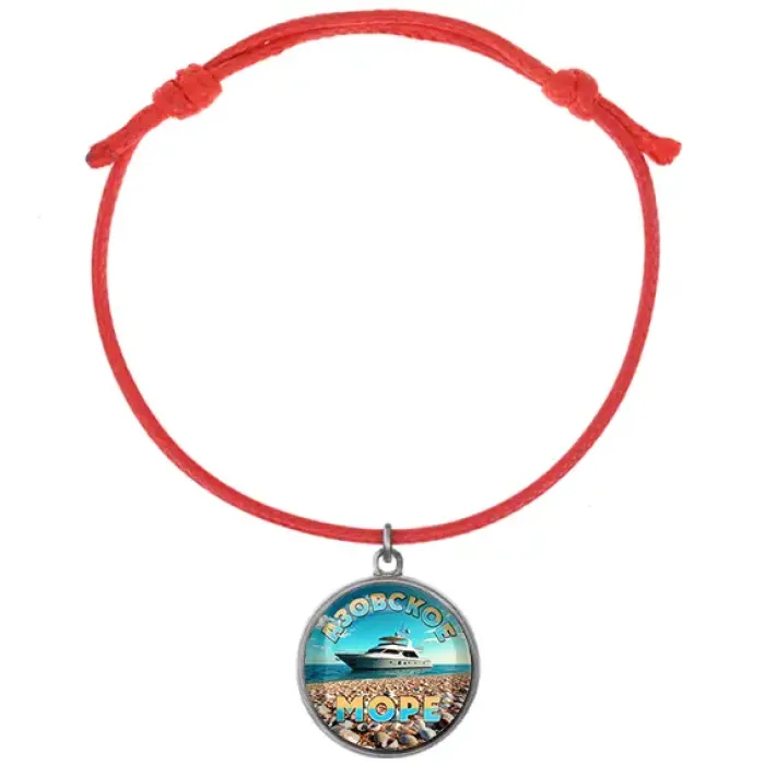 Браслет из шнура с металлической подвеской. Подвеска имеет полиграфическую вставку под выпуклым стеклом.
