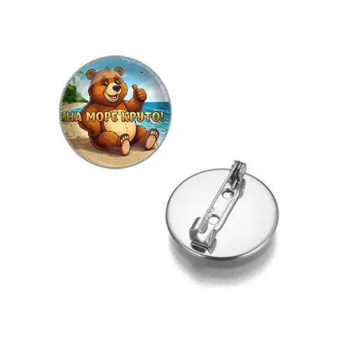 Круглый сувенирный значок из бижутерного сплава с серебристым покрытием и надписью «На море круто».