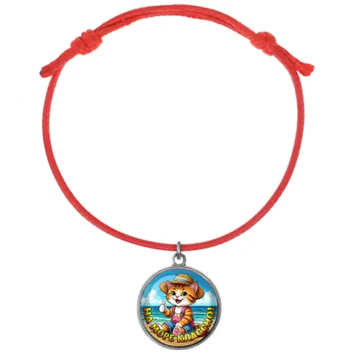 Браслет из шнура красного цвета с подвеской на металлической основе.