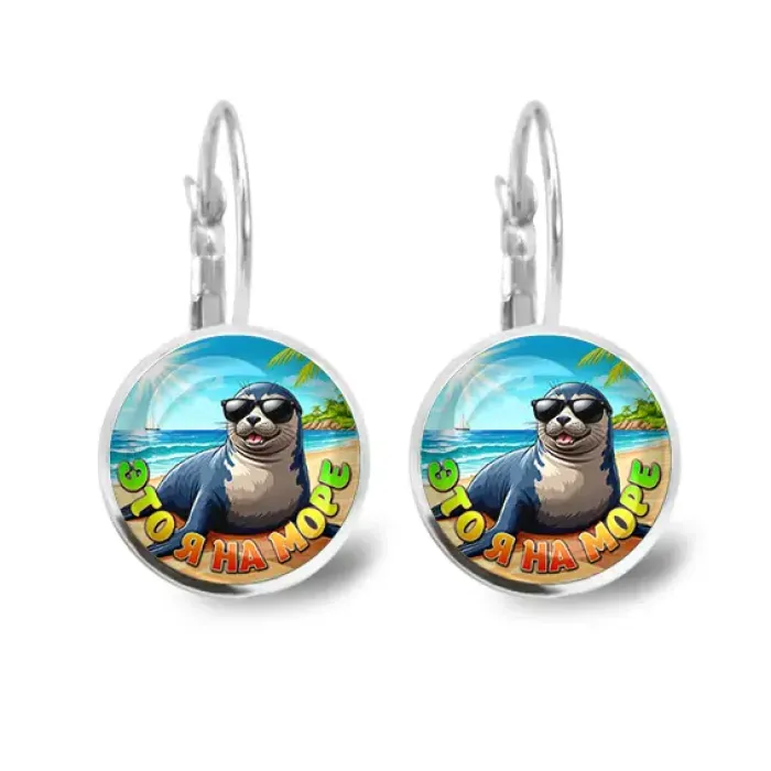 Серьги для ношения, выполненные из бижутерного сплава с покрытием под серебро и стекла. Дизайн включает изображения под выпуклыми стеклянными линзами диаметром 18 мм и замок типа левербэк.
