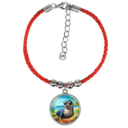 Браслет из красного шнура с металлической основой и изображением под выпуклым стеклом.