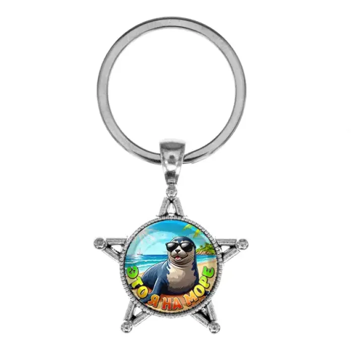 Брелок-сувенир из бижутерного сплава с изображением под стеклянной линзой.