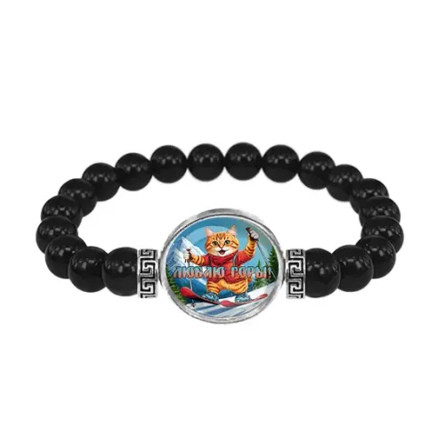 Стрейч-браслет из натурального чёрного агата с изображением под выпуклой стеклянной линзой.