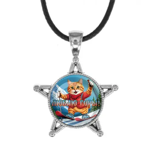 Сувенирный кулон в виде звезды с изображением гор. Изготовлен из бижутерного сплава под серебро, изображение защищено выпуклой стеклянной линзой.