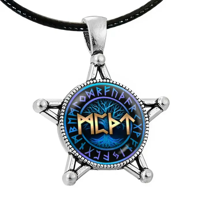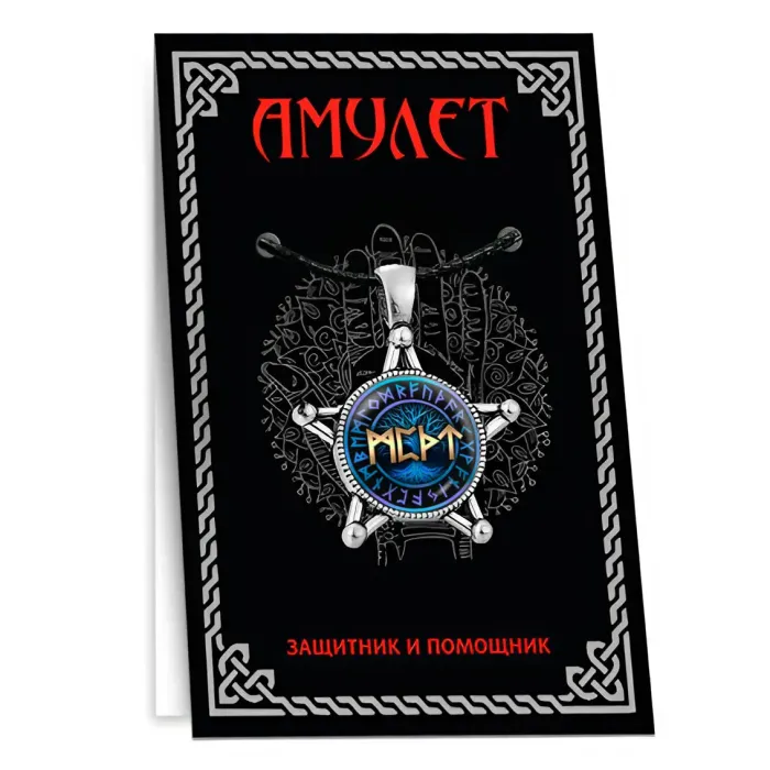 Материал и изготовление: Бижутерный сплав под серебро. Изображение размещено под выпуклой стеклянной линзой. На амулете нанесены руны Манназ, Перт, Турисаз и Тейваз.