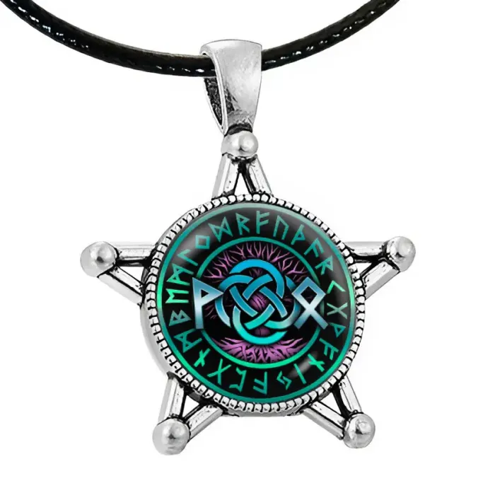Рунический амулет из бижутерного сплава под серебро с изображением под выпуклой стеклянной линзой.