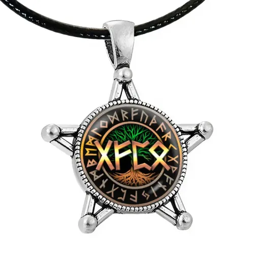 Сувенирный амулет из бижутерного сплава под серебро с изображением рун под выпуклой стеклянной линзой.