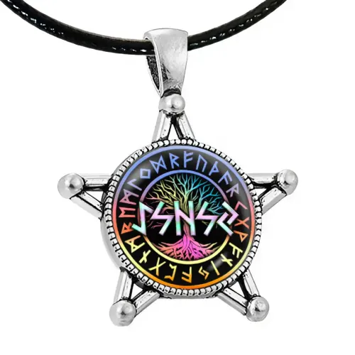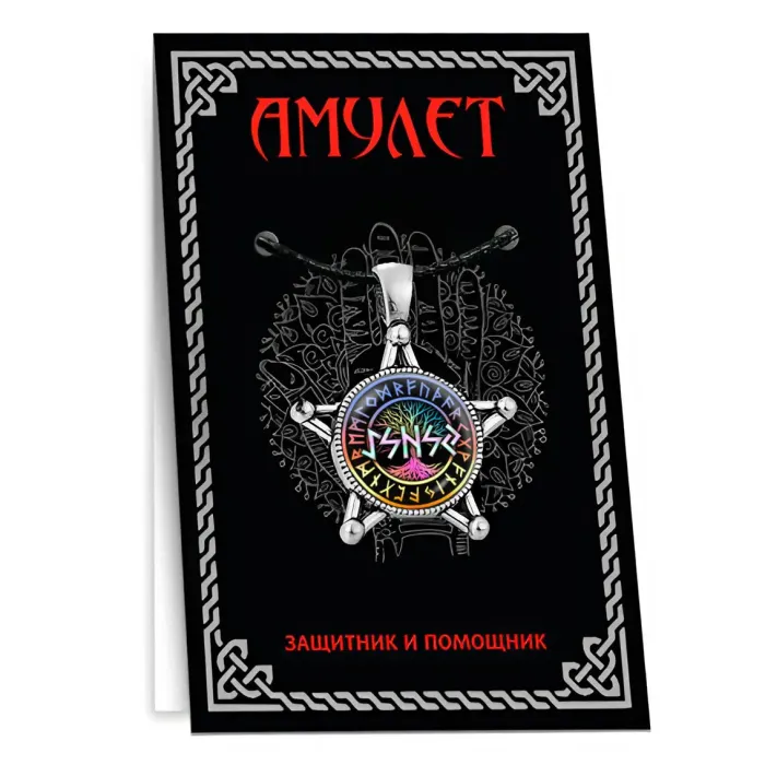 Материал и изготовление: Бижутерный сплав под серебро. Изображение защищено выпуклой стеклянной линзой. На амулете изображены руны Эйваз, Соулу, Хагалаз и Йера.