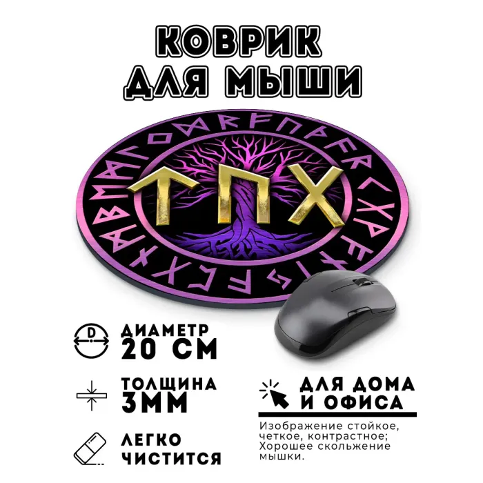 Коврик для мыши с нанесённой рунической формулой. Диаметр 20 см, толщина 3 мм.