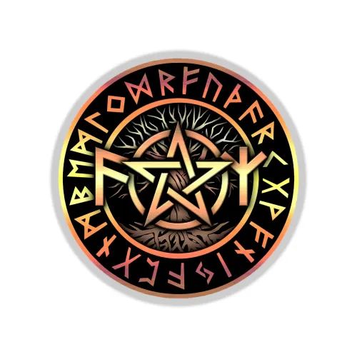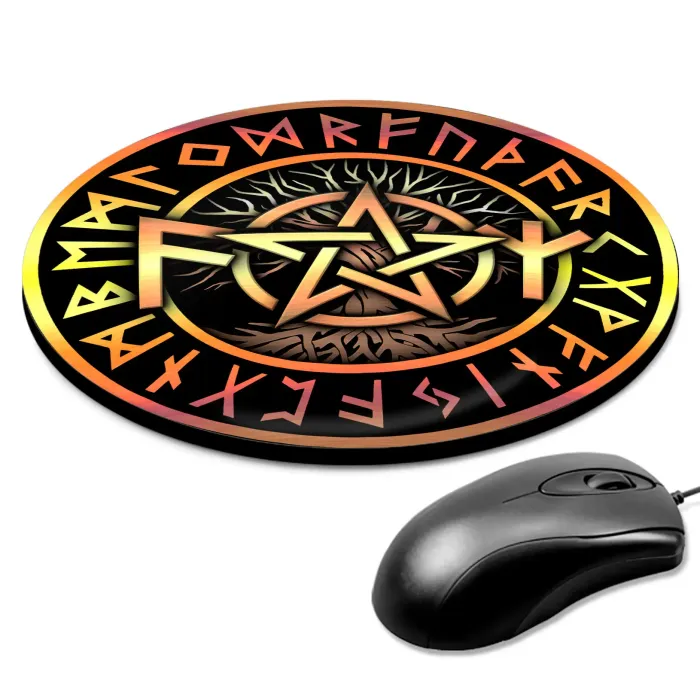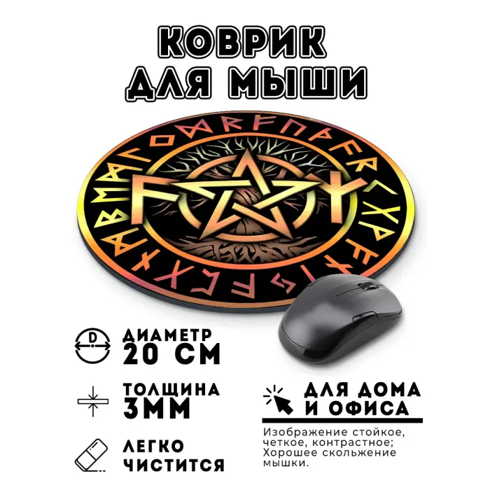 Коврик для мыши с изображением рунических формул и пентаграммы. Диаметр 20 см, толщина 3 мм.