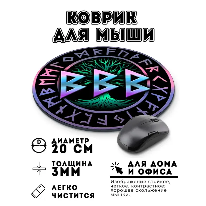 Коврик для мыши с руническими формулами. Диаметр 20 см, толщина 3 мм.