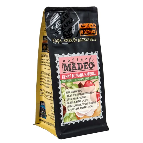 Плантационный кенийский кофе Madeo Mchana, обработанный натуральным методом (Natural), обладает ярким фруктовым характером. Средняя обжарка раскрывает сбалансированный вкус с нотами черешни, винограда и лёгкими шоколадными оттенками, бархатистой текстурой и долгим послевкусием.