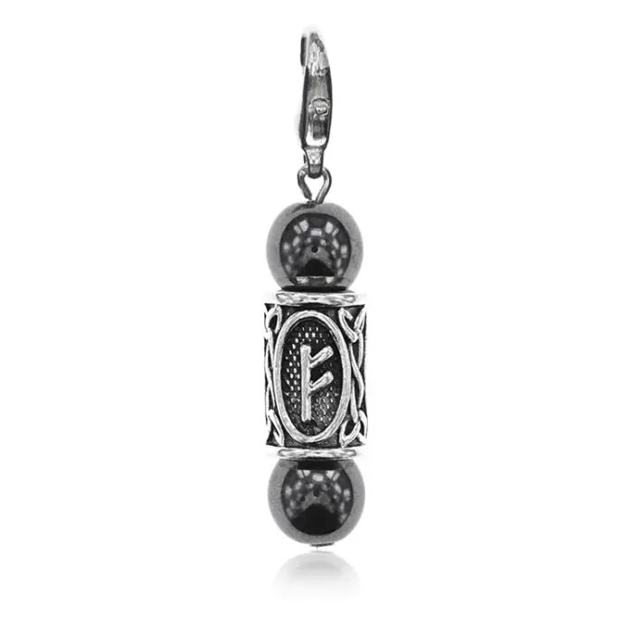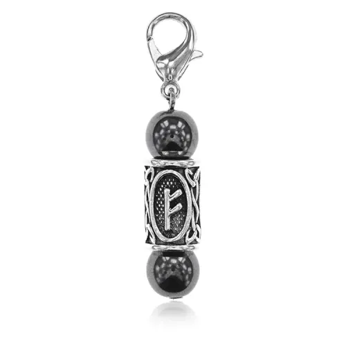 Брелок-амулет с руной Феху из синтетического гематита и бижутерного сплава.