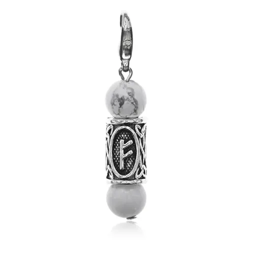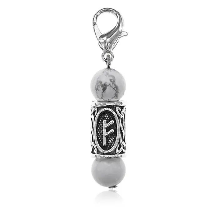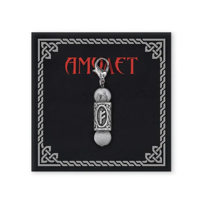 Брелок-амулет с руной Феху из натурального камня кахолонг и бижутерного сплава.