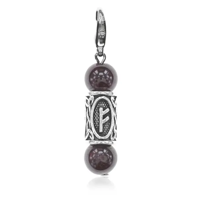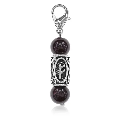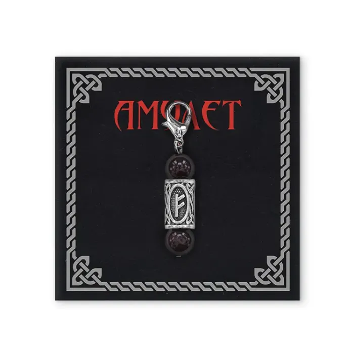 Брелок-амулет Феху выполнен из натурального камня граната и бижутерного сплава под серебро в виде рунического символа.