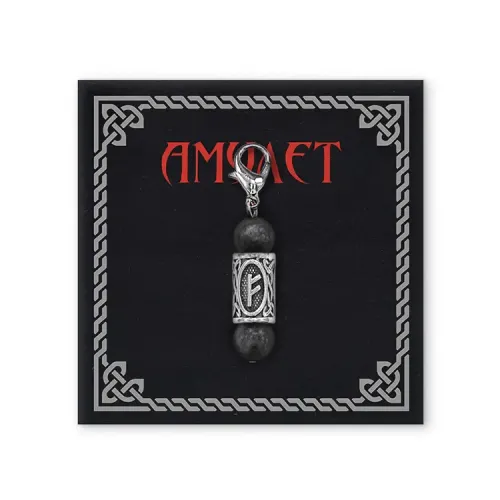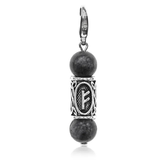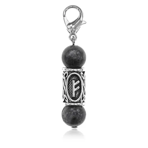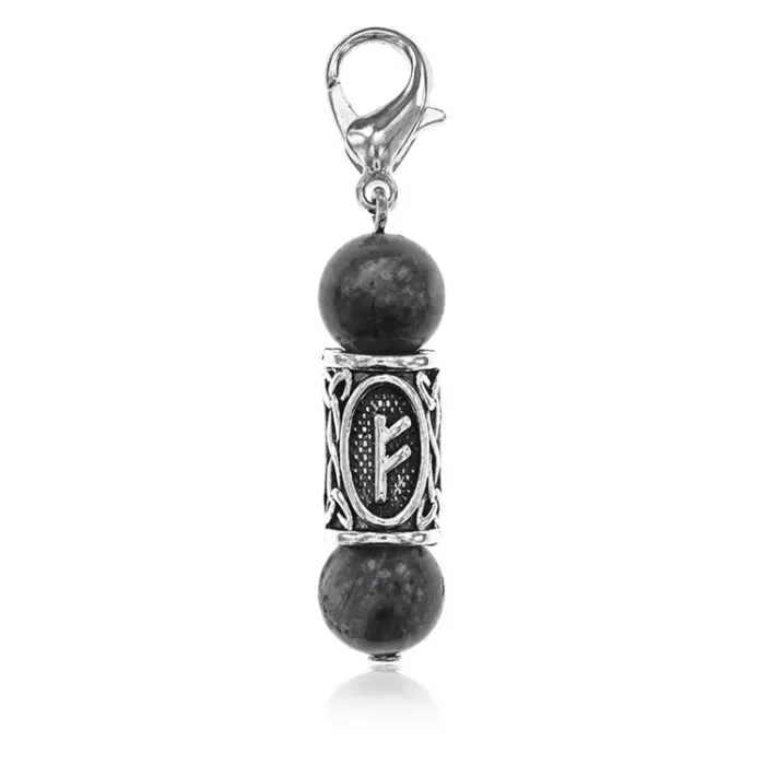 Брелок-амулет с руной Феху из натурального камня лабрадор и бижутерного сплава.