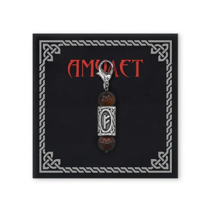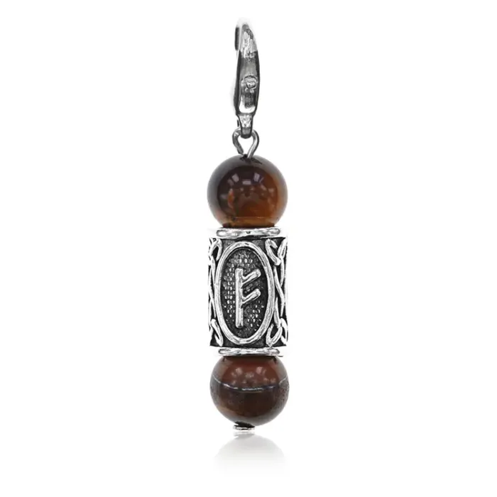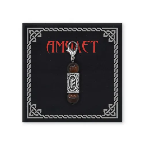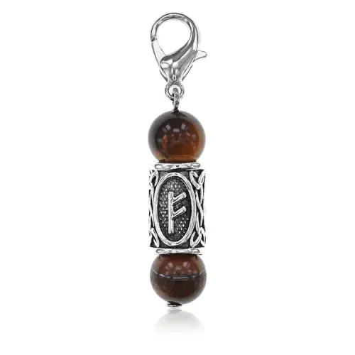Брелок-амулет с руной Феху из натурального камня тигровый глаз и бижутерного сплава.