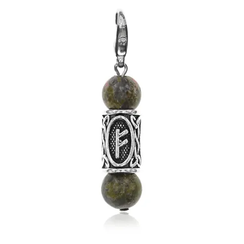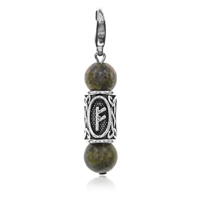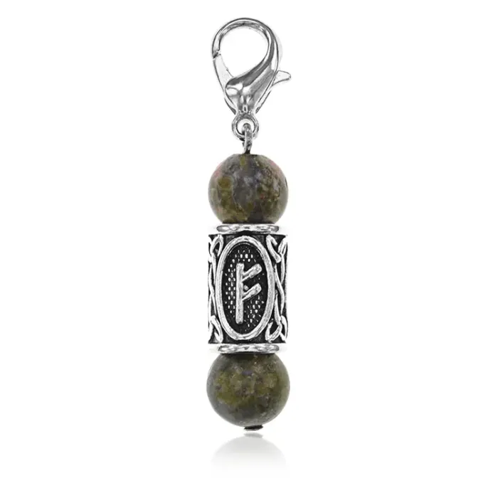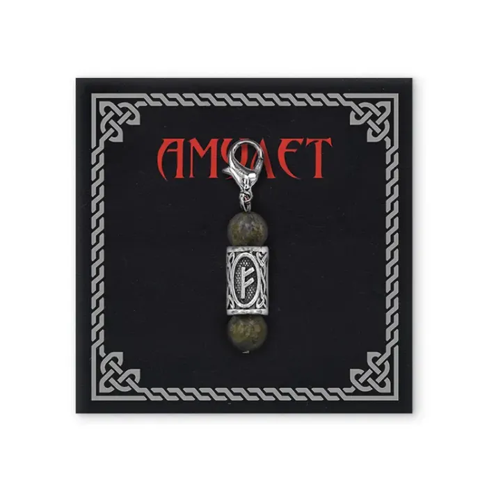 Брелок-амулет из натурального камня унакит и бижутерного сплава под серебро с изображением руны Феху.