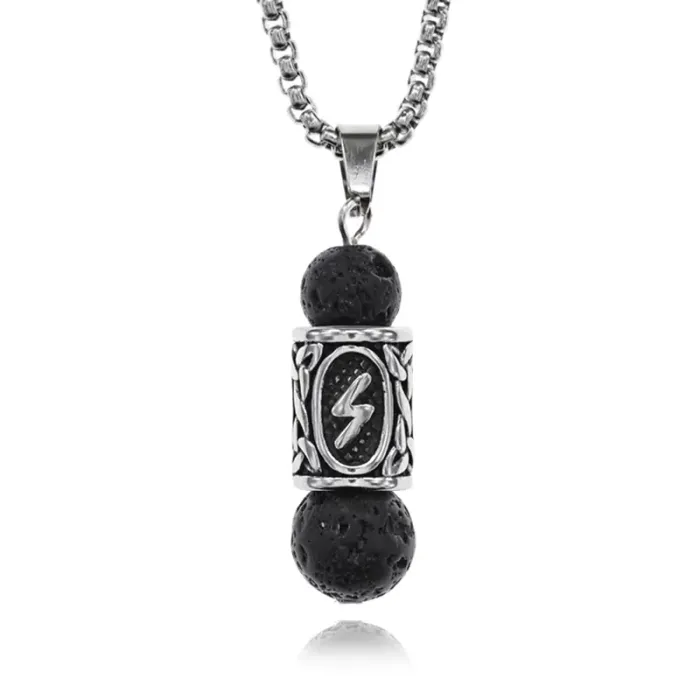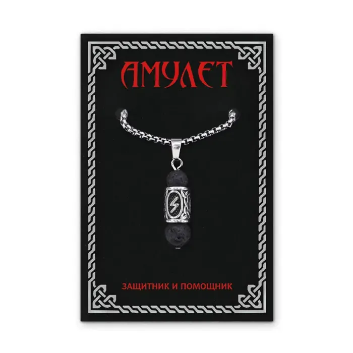 Кулон-амулет с руной Сила из нержавеющей стали и натурального камня лава.