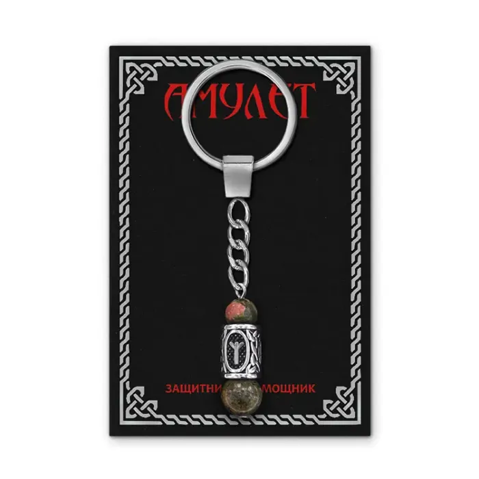 Брелок-амулет с руной Мир из нержавеющей стали и натурального камня унакит.