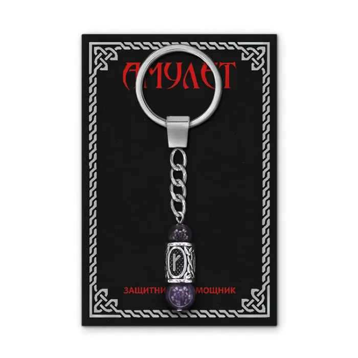 Брелок-амулет из нержавеющей стали с руной Крада и натуральным аметистом.