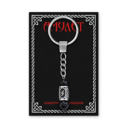 Брелок-амулет с руной Сила из нержавеющей стали и натурального чёрного агата.