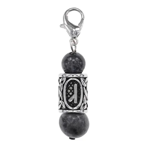 Брелок-амулет из нержавеющей стали с изображением руны Алатырь и вставкой из камня лабрадор.