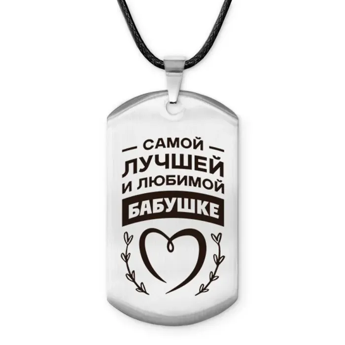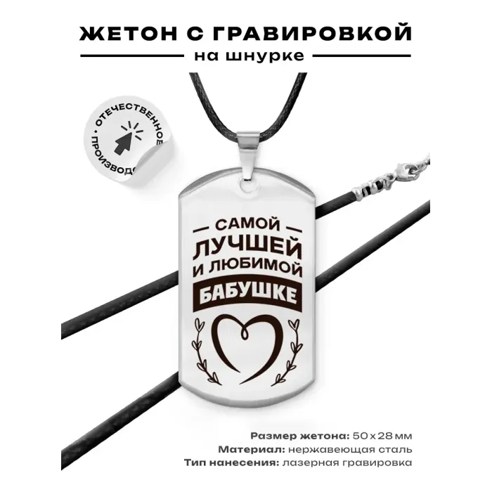 Брелок-жетон с гравировкой «Самой любимой бабушке». Изготовлен из полированной нержавеющей стали.