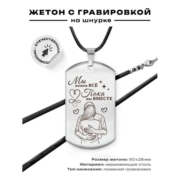 Размеры и комплектация: Размер жетона 50х28 мм. В комплекте шнурок с застёжкой. Упаковка — прозрачный пакет.