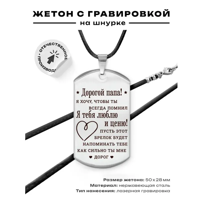 Размеры и комплектация: Размер жетона 50х28 мм. В комплекте шнурок с застёжкой. Упаковка — прозрачный пакет.