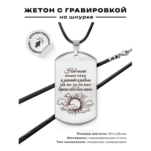 Размеры и комплектация: Размер жетона 50х28 мм. В комплекте шнурок с застёжкой. Упаковка — прозрачный пакет.